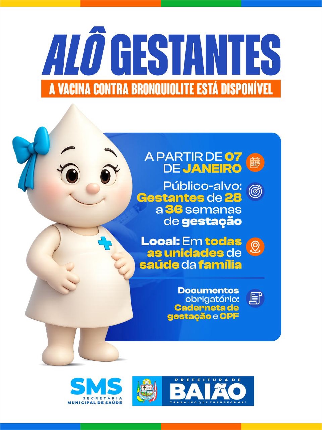 A vacina contra a bronquiolite já está liberada e disponível em todas as unidades de saúde do município.
