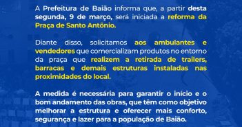 A Prefeitura de Baião informa que, a partir desta segunda-feira, 9 de março, terão início as obras de reforma…