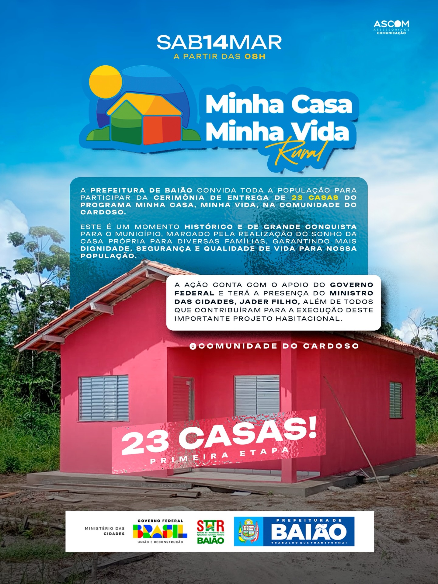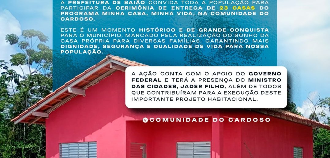 Neste sábado, 14 de março, a partir das 8h, a Prefeitura de Baião realizará a cerimônia de entrega de 23 casas da primeira etapa do programa Minha Casa, Minha Vida Rural, na Comunidade do Cardoso.